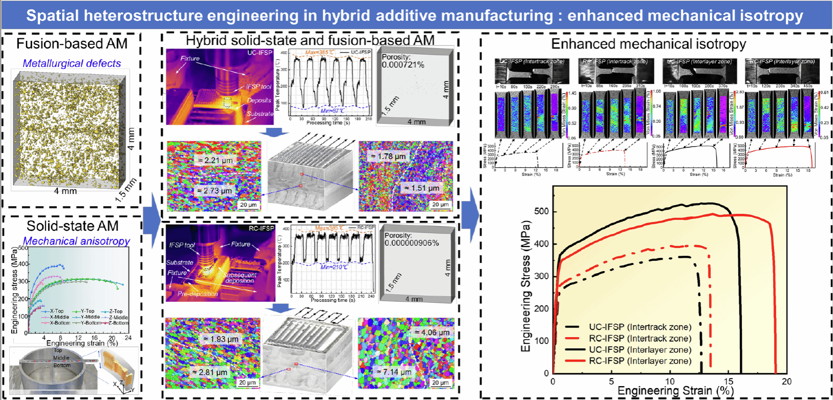 本文研究系统地分析了单向循环搅拌摩擦(UC-IFSP)和往复循环搅拌摩擦(RC-IFSP)在原生孔隙闭合、热力历史、微观结构演变、以及力学性能(在构建方向和水平方向上)方面的差异及其潜在机制。不同的加工轨迹设计原位实现了多方向晶粒尺寸和析出相的梯度分布,成功构型出两类异质结构:包括UC-IFSP沿构建方向的层状异质结构和RC-IFSP策略下沿构建&水平方向的空间异质结构。空间异构构型相较于层状异构在保持较优延展性前提下实现的强度各向同性的提升
