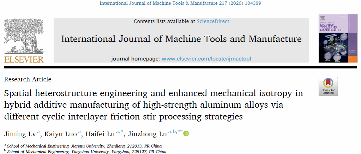 近日,我校机械工程学院鲁金忠教授团队在机械加工领域顶刊《国际机床与制造杂志》(International Journal of machine tools and manufacture)上发表了题为“Spatial heterostructure engineering and enhanced mechanical isotropy in hybrid additive manufacturing of high-strength aluminum alloys via different cyclic interlayer friction stir processing strategies”的研究论文。该研究成果提出了一种通过层间搅拌摩擦轨迹设计来进行激光定向能量沉积构件异构构型的方法,建立了原生冶金缺陷消除与微观异构构型相结合的热机械加工策略。该复合制造工艺将传统高强铝合金锻板高度依赖纳米析出相的单一强化机制转变为析出相、位错、晶界和异质形变的多元协同强化机制。博士生吕继铭为第一作者,鲁金忠教授和卢海飞副教授为共同通讯作者。