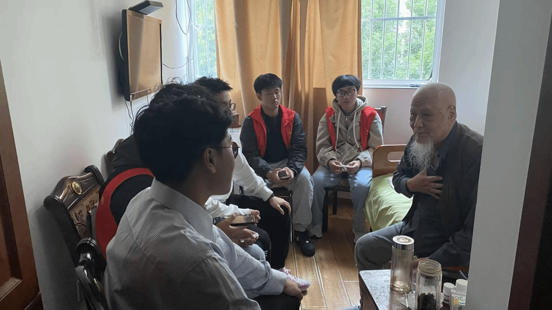 香囊制作完成后,志愿者们分组将这份充满心意的节日礼物亲手赠送给每一位老人,并与他们促膝长谈。大家关切地询问老人们的身体状况和日常生活,认真聆听他们讲述过往的故事。同时其他志愿者邀请留学生代表一同探访了院内一位曾参加过抗美援朝战争的老兵。爷爷曾担任跨国公司高级工程师,精通外语,与留学生积极交流,展示曾经抗战工作相册,鼓舞志愿者踏实求学,精益求精。