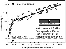Nanoparticles-laden gas film (NLGF) was formed by adding SiO2 nanoparticles with certain volume fraction into the air gas film in a thrust bearing. An effective viscosity of the gas-solid two phase lubrication media was introduced. The pressure distribution in NLGF and the load capacity of the thrust bearing were investigated both by experimental and numerical methods. The results showed that the NLGF can increase the load capacity when the film thickness is larger than 30 lm. The mechanism of the enhancement effect of load capacity was attributed to the increase of the effective viscosity of the NLGF from the pure air film, and the novel lubrication media of the NLGF can be expected for the bearing industry application.